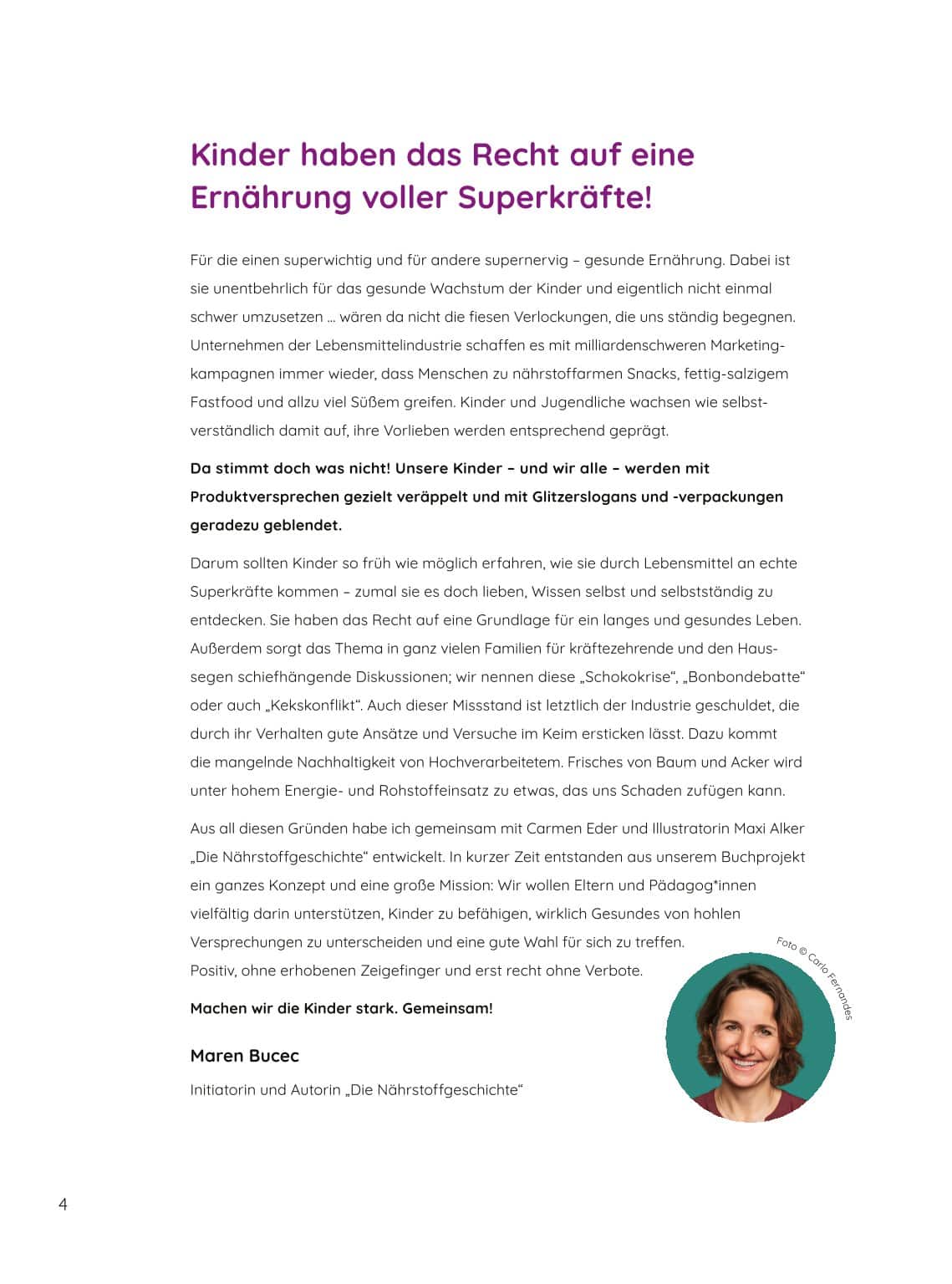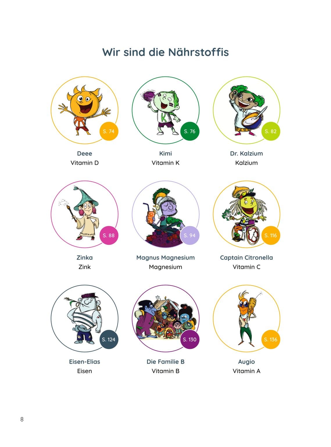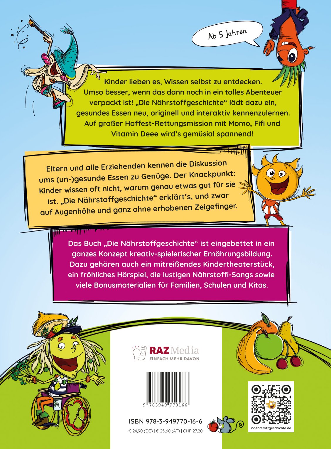 Die Kinder selbst entdecken durch das Buch und seine interaktiven und spielerischen Anregungen, weshalb gute, vitamin- und mineralstoffreiche Ernährung so wichtig für sie ist: für Körper und Geist, fürs Groß-, Stark- und Schlauwerden. „Die Nährstoffgeschichte“ befähigt sie, beim Einkaufen, Kochen und Snacken selbst richtige Entscheidungen zu treffen und die Unterschiede von frischen gegenüber hochverarbeiteten Produkten zu verstehen.