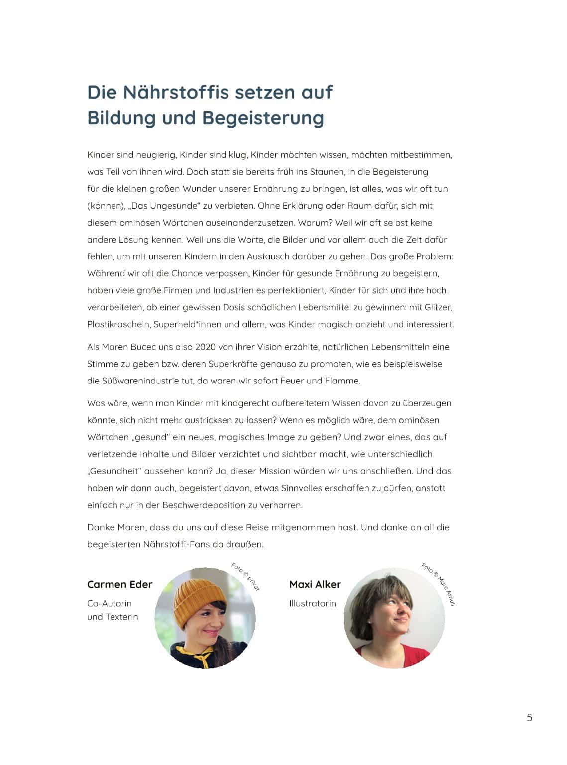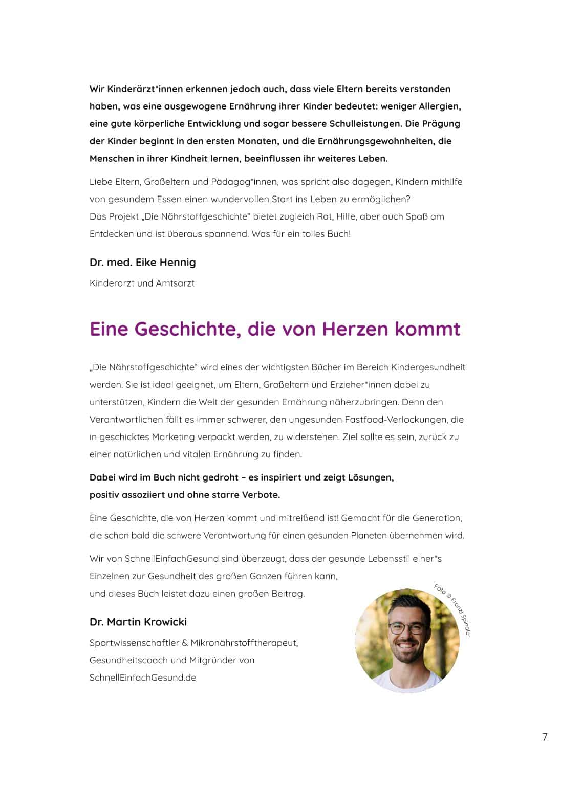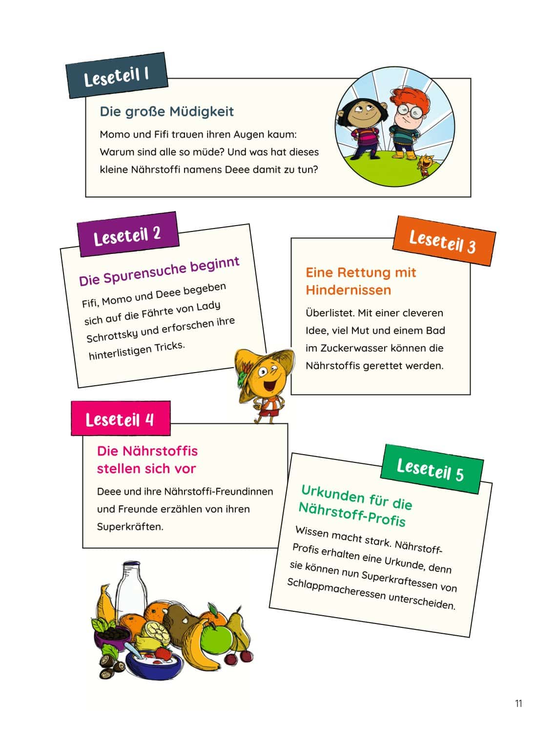 Die Kinder selbst entdecken durch das Buch und seine interaktiven und spielerischen Anregungen, weshalb gute, vitamin- und mineralstoffreiche Ernährung so wichtig für sie ist: für Körper und Geist, fürs Groß-, Stark- und Schlauwerden. „Die Nährstoffgeschichte“ befähigt sie, beim Einkaufen, Kochen und Snacken selbst richtige Entscheidungen zu treffen und die Unterschiede von frischen gegenüber hochverarbeiteten Produkten zu verstehen.